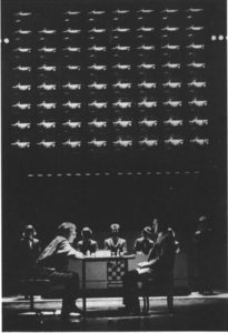 A series of three Philips Vidiwalls provides a giant multi-screen display for the musical 'Chess', now playing at the Prince Edward Theatre in London. One of the main features of the show is a large 64-screen version (pictured right) depicting a chessboard, which flies in on steel cables during the performance. It weighs 3.8 tonnes, and the screen shows the moves of chess pieces from famous matches as part of the story and all the TV monitors can combine their images to show one enormous picture of the actors on stage and videos providing background to the events prepared on stage.
