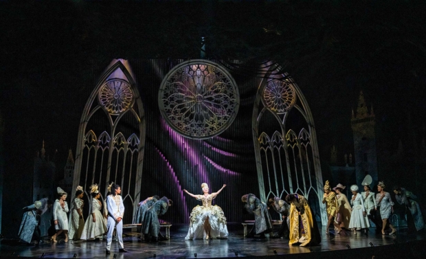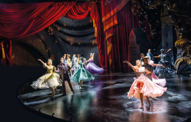 The Royal Ball at the start of Act II makes use of the revolving auditorium built into the theatre. Cats also made use of the feature. The first 7 rows of the stalls, along with a large portion of the stage slowly and smoothly revolve to move the action into the middle of the auditorium.