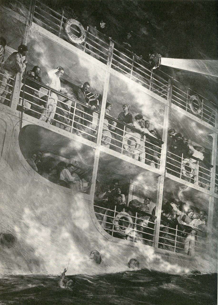 "Glamorous Night" Ivor Novello musical, Theatre Royal Drury lane 1935. 'The second act introduced the spectacular shipwreck of the cruise liner Silver Star. Under the direction of the stage manager, the structure of the three decks, complete with practical promenades and companionways, was built on one of the down-stage platforms. The wreck commenced with several explosions, smoke pouring across the stage, as the passengers began to panic; then the whole ship lurched to one side and began to sink inexorably into the ocean. The curtain fell and rose again on a scene of total chaos; the audience, shattered and delighted, needed the interval to recover!